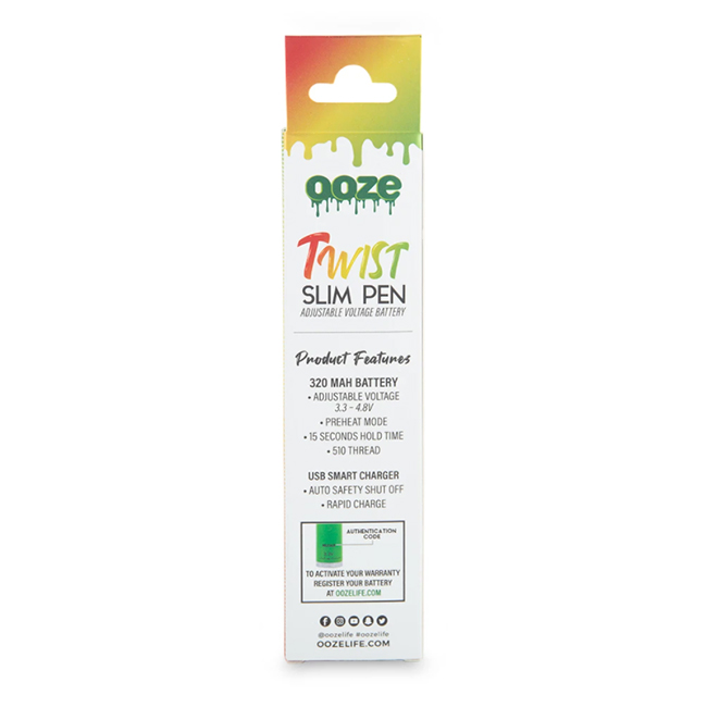 SLIM PEN TWIST BATTERY + SMART USB Forget all vape pens you’ve smoked before. The OOZE Slim Pen Twist battery blows all other vaporizers out of the water! Featuring the new preheat mode (15 seconds of continuous heating without holding the button) and adjustable temperature settings, the Slim Pen Twist Battery is perfect for anyone just starting to use cartridges or your everyday veteran. Compatible with all oil, concentrate, and essential oil cartridges with a 510 thread, and voltage settings range from 3.3V to 4.8V.