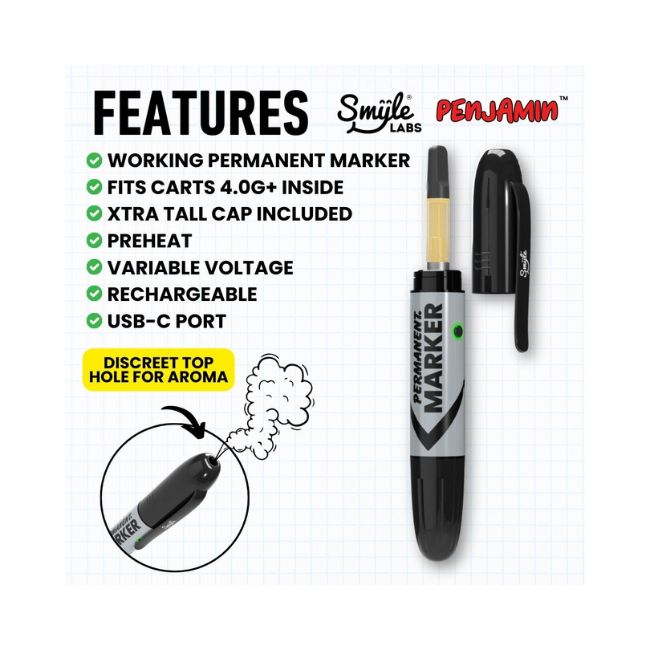The SMYLE PENJAMIN PERMANENT MARKER FITS CART 0.5G UP TO 4G BATTERY 5CT/BOX is the perfect choice for vapers looking for versatility, reliability, and style. Designed to fit a wide range of cartridges (from 0.5g to 4g), this battery ensures a smooth, consistent vaping experience with every use. Choose from two sleek color options—Black or Silver—to match your personal style. With its permanent marker shape, powerful performance, and 5-battery box, the SMYLE PENJAMIN provides exceptional value for vapers who need a dependable and stylish device. Whether you prefer a classic black or a shiny silver finish, this battery is designed to meet your vaping needs in style